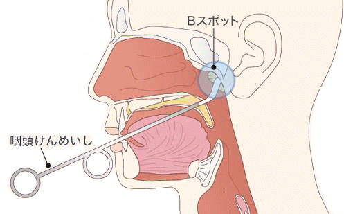 Bスポット療法とは鼻の奥、喉の上あたり(の炎症を起こしている部位)に、塩化亜鉛を塗布する方法で鼻咽腔炎の治療として行われます。